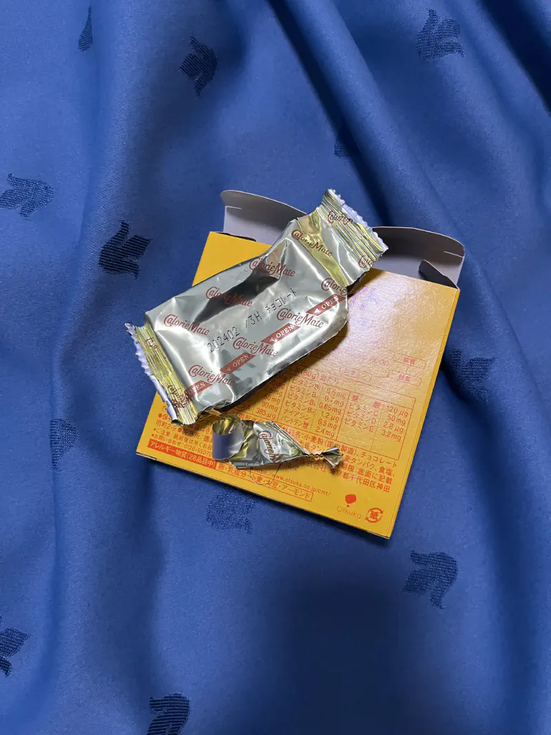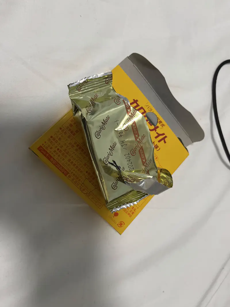 2日目の朝食、カロリーメイト2本。画像は省略。