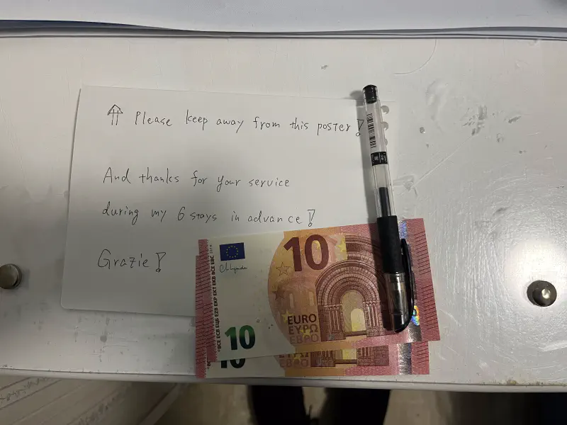 さて、ここで会場に行くにあたって問題なのが、部屋の中のものが盗られないかどうか。 ホテルで荷物が盗られるというのも(イタリアじゃないけど)よく聞く話。 それに加えて、イタリアはベッドメイキングに対してチップを払うべきなのか問題もある。 ネット情報だと最近だとベッドメイキングに対してはチップは要らないのが最近の主流とあったが、実際のところ分からず。 チップがないことに切れて荷物奪ったろwwwと思われたら泣いてしまう。 だが、いつ払うべきなのか、毎日払うべきなのか、どんくらい払うべきなのか等も含めて何もわからない。