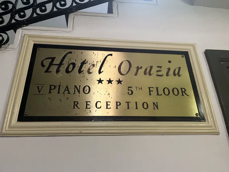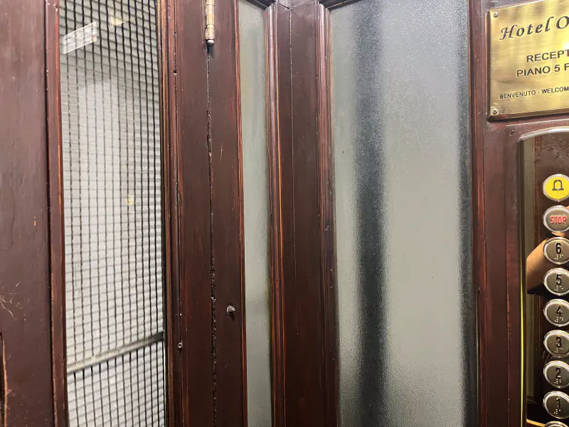 流石にこれに乗るのは気が引けたため、 仕方なく重たいキャリーを持って階段を使うことに。 5Fということは、日本で言う1FがGroundだから6F分登ることに。 しかもイタリアの階段は段差がデカい。 それはもうぜぇぜぇ言いながら上に登った。 ちなみにこの時点で帰りたさは129%を超えていた。 なんとか受付に到着。 チェックインよろとだけ言ってチェックイン。